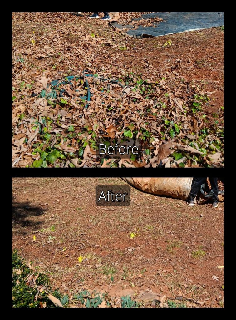 I took the boys over to help her uncover the new life emerging from the ground. They gathered their rakes and blowers and began to work to uncover what winter had sheltered. Soon, the dry, brown carpet was replaced by the greens, yellows, and purples of spring. The boys took tarp after tarp of dead foliage to the woods, and were soon worn out from their efforts.